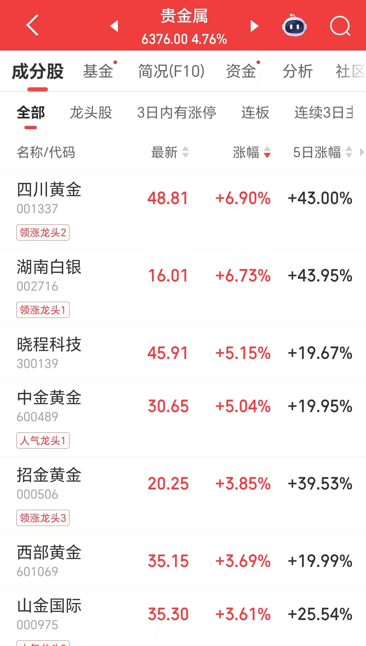 {jz:field.toptypename/}1月23日,A股贵金属板块开盘大涨。甘休发稿前,四川黄金和湖南白银涨幅接近7%,晓程科技、中金黄金涨幅跳跃5%,招金黄金、西部黄金、山金海外等跟涨。