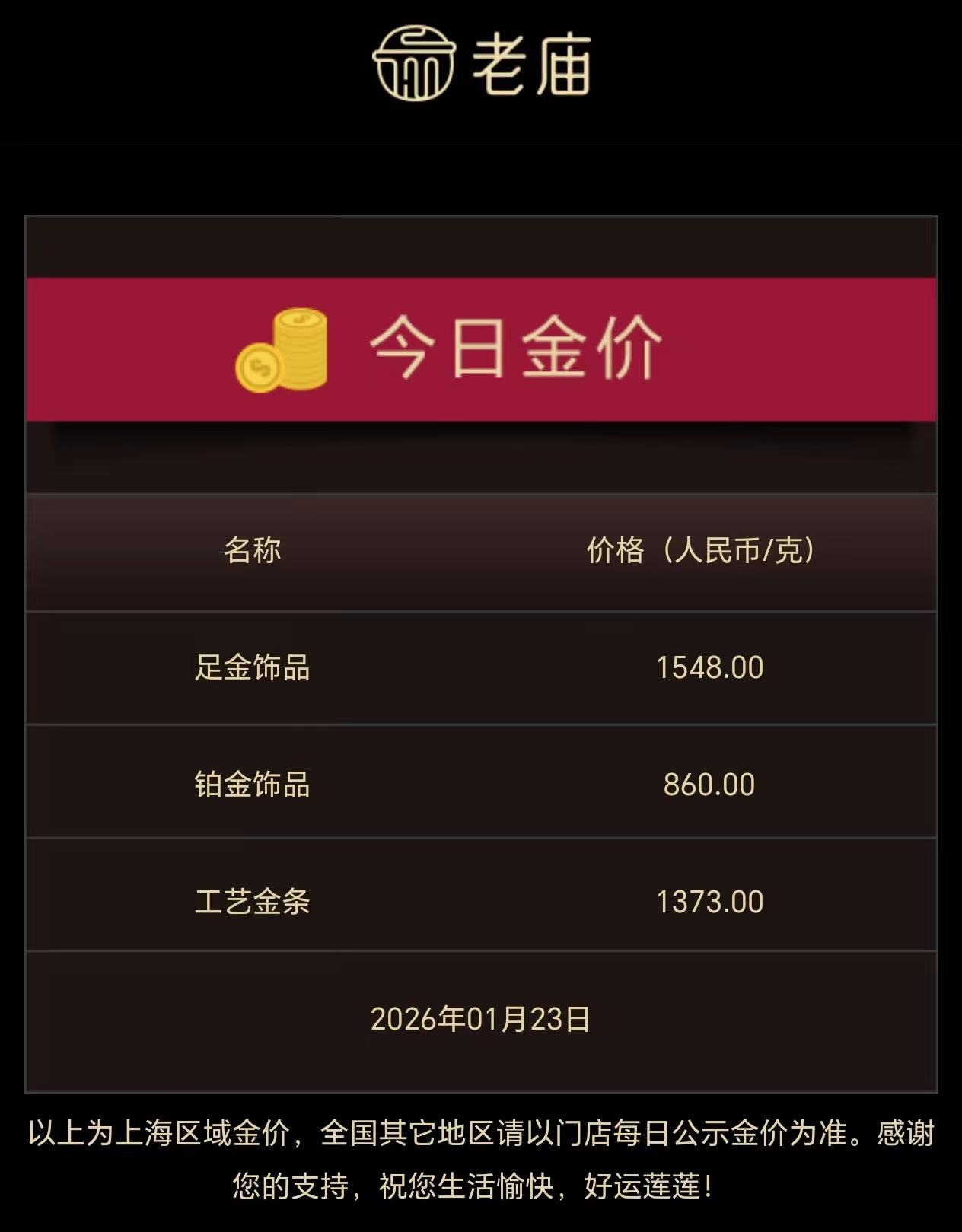同日,国内黄金饰品品牌价钱也随之飙升。其中,周生生足金饰品克价为1545元,单日飞腾53元/克;老凤祥足金克价升至1538元,单日飞腾43元/克;老庙黄金克价钱升至1548元,单日飞腾52元/克。