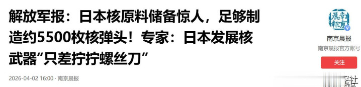 南京晨报——目田军报:日本核原料储备惊东说念主,敷裕制造约5500枚核弹头!各人:日本发展核火器“只差拧拧螺丝刀”2026-04-02