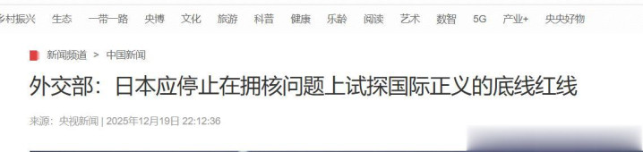 央视新闻——玩忽部:日本应住手在拥核问题上试探国外正义的底线红线2025年12月19日