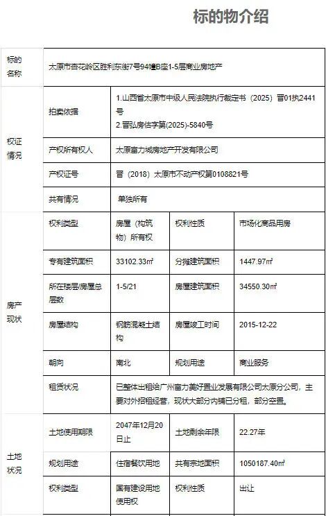 近日,山西省太原市中级东谈主民法院日前发布变卖公告,将于2026年4月8日10时起,通过淘宝网法则拍卖麇集平台对太原市杏花岭区得胜东街7号94幢B座1-5层生意房地产进活动期60天的公开变卖。
