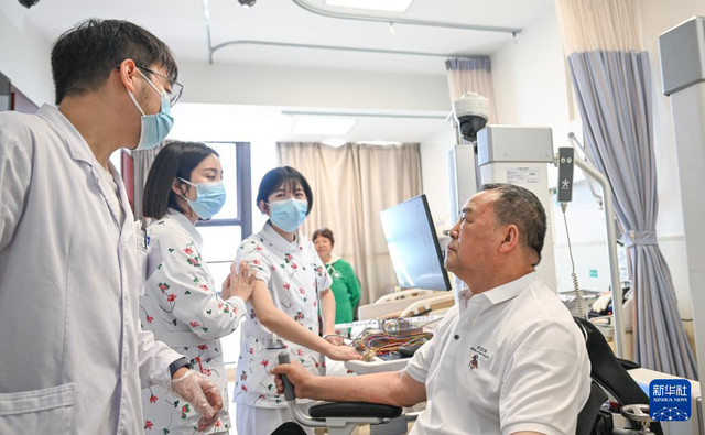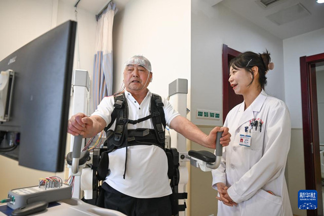 4月10日,医护东说念主员在治愈前与李清东相似病情。4月10日,在位于重庆医科大学附属第二病院的西南地区首个脑机接口临床议论型病房,72岁的脑梗患者李清东在医护东说念主员的指点下,佩带无创脑机接口收罗竖立,尝试通过“绽放思象”范式,范围我方瘫痪的左下肢进行通俗算作,完成了一次通过“意念范围”来进行的康复治愈。端梗直今,已有畸形100例瘫痪患者在此体验联系诊疗管事。新华社记者陈诚摄