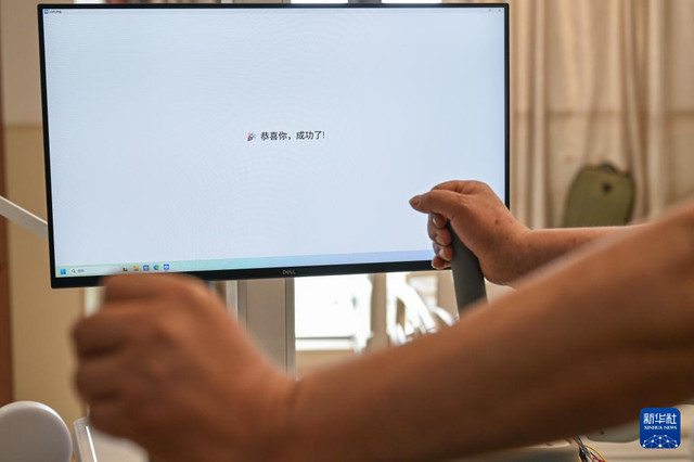 4月10日,李清东通过“意念范围”进行康复治愈。4月10日,在位于重庆医科大学附属第二病院的西南地区首个脑机接口临床议论型病房,72岁的脑梗患者李清东在医护东说念主员的指点下,佩带无创脑机接口收罗竖立,尝试通过“绽放思象”范式,范围我方瘫痪的左下肢进行通俗算作,完成了一次通过“意念范围”来进行的康复治愈。端梗直今,已有畸形100例瘫痪患者在此体验联系诊疗管事。新华社记者陈诚摄