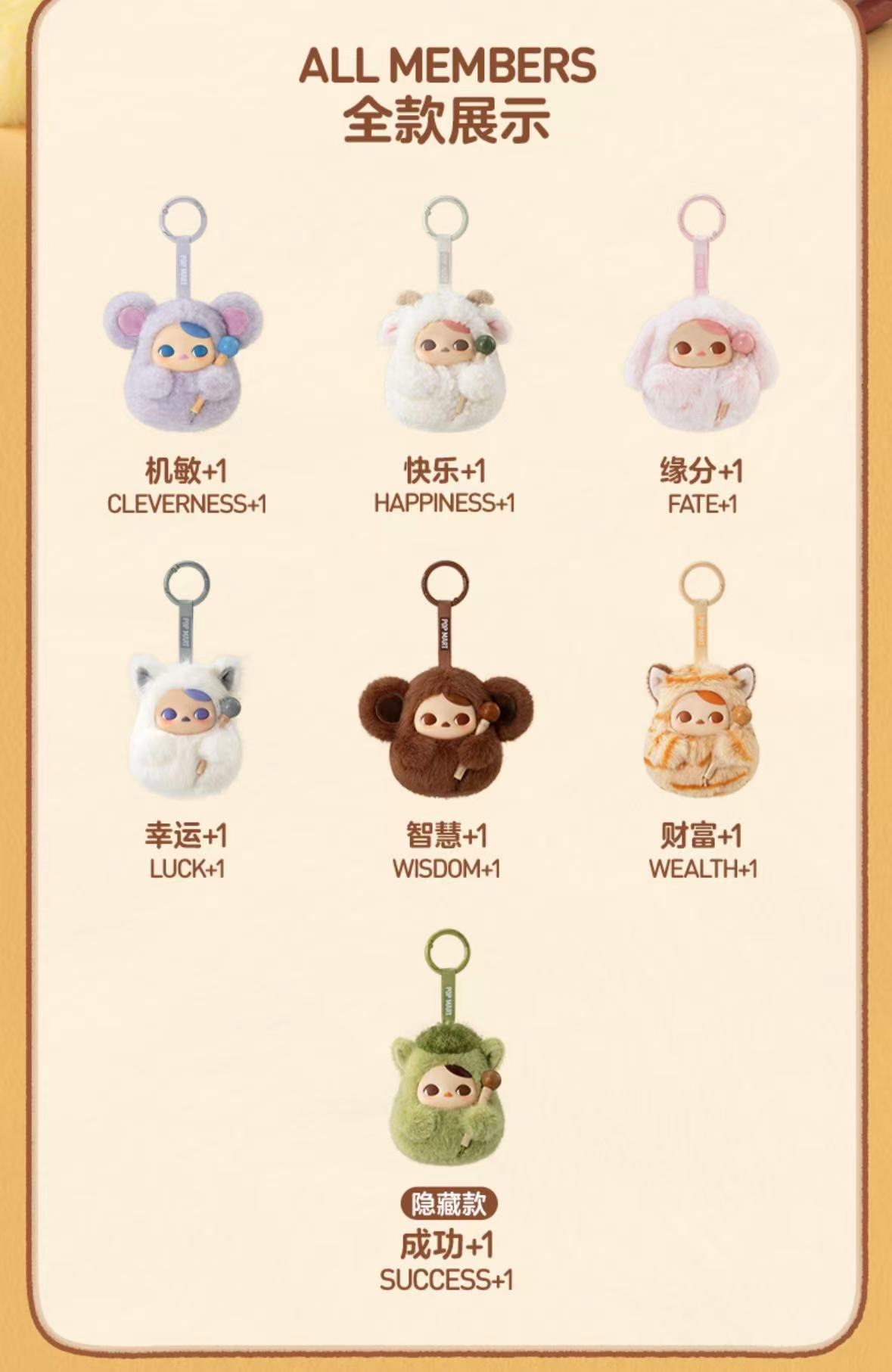 “PUCKY敲敲系列”为搪胶毛绒挂件,该系列盲盒选拔6款旧例脚色 + 1款荫藏款的成立,单盒售价为99元,整盒(6个)售价为594元。居品中枢亮点在于轻拍头部即可发出清翠传神的木鱼声效,每款还标注“金钱+1”“惬心+1”“奢睿+1”等祥瑞寓意,契合了当下年青东说念主用爽气形式缓解神志的需求,被封为“打工调养神器”。