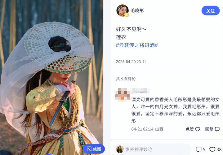 咫尺的毛晓彤,越来越多的出咫尺电视剧的作品之中,4月20号她发布了一张相片,配文是好久不见莲衣。