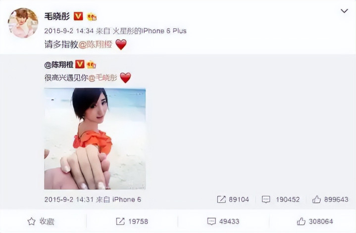 2015年陈翔发微博承认了两个东谈主之间的恋情,毛晓彤其时也极端爱他,赶快就发微博进行了回复。