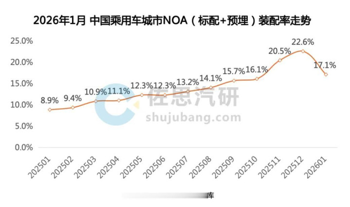 不外当今这个比例正在徐徐普及,到2025年12月份时,比例照旧普及到了22.67%,本年略有下滑,但趋势很清爽,那便是越来越多的汽车,额外是20万以上的汽车,安装城市NOA照旧成为了一种主流。