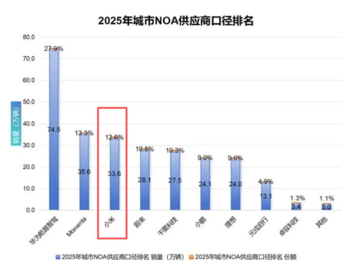 小米是因为2025年卖的车委果是太多了,岂论是SU7如故YU7,它齐是安装有城市NOA功能的,销量高了,份额当然就高了。